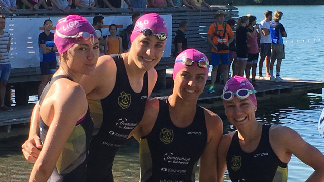 Den Anfang machten die Damen. Nadja Herbst, Elena Peppler, Tabea Kunz und Katharina Poker starteten um 9:15 Uhr auf die 1,5km lange Schwimmstrecke im Erbacher Baggersee. Nach solider Schwimmleistung, einer guten Rad- und Laufleistung belohnten sich die Damen am Ende mit Rang 12 in der Mannschaftswertung.