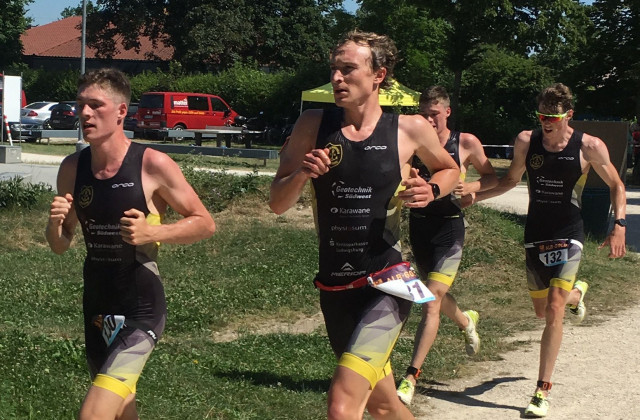 Nach einer beispiellosen Schwimmleistung, welche dafür sorgte, dass das Team in mitten der zuvor gestarteten Landesliga Süd aus dem Wasser kam, war von Beginn an klar, dass die 1. Mannschaft nichts anbrennen lässt. Beim Radfahren bauten die Jungs ihre Führung weiter aus und brachten diese dann auch mit zwei Minuten Vorsprung ins Ziel. Am Ende war es die schnellste Schwimm-, Rad- und Laufzeit.