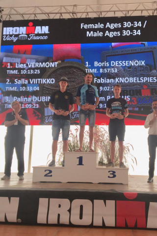 Knobelspies hatte bisher eine enorm starke Saison abgeliefert und zeigte auch in Vichy von Anfang an, dass er sich bei Rennen über die Langdistanz in der absoluten Spitze etabliert hat. In einem Teilnehmerfeld von über 1500 Sportlern traten in seiner Altersklasse der 30- bis 34-jährigen 205 Athleten an. Bereits auf der Schwimmstrecke (3,86 km) im Lac d'Allier zeigte sich, dass Knobelspies die Chance hatte, ganz vorne mitzumischen. Er verließ nach 54:03 Min. als achter Sportler insgesamt das Wasser. Dies bedeutete zu diesem Zeitpunkt in seiner Altersklasse Rang vier.