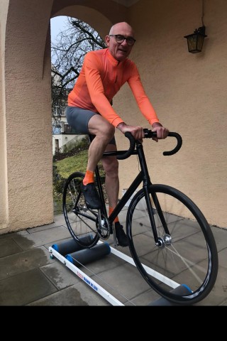 Dieter Frey besitzt zwei Fixies, eins mit Bremsen für die Straße und eins ohne Bremsen fürs Training auf der Rolle. Fixies seien „ein bisschen spinnert“, sagt er, „machen aber total Spaß“. Das Radeln auf der Kellerterrasse sei zunächst gewöhnungsbedürftig gewesen, es sei halt viel kälter als beim Spinning im Sportstudio. Aber mittlerweile habe er großen Gefallen gefunden am Training mit langem Trikot und Mütze bei Wind und bei Wetter. Technische Spielereien benötige er nicht, sagt Dieter Frey. Viele Indoor-Radler haben sich in diesem Corona-Jahr top moderne Spinning-Maschinen zugelegt, die alle möglichen und auch ein paar unmögliche Daten messen, etwa den Pulsschlag. Auf einem Bildschirm könnte Dieter virtuell die Pässe hoch fahren oder sich online mit anderen Radfahrern messen. Alles nicht sein Ding. „Ich bin schon so oft zum Beispiel das Stilfser Joch oder den Mont Ventoux hoch gefahren, das stelle ich mir auf der Rolle einfach vor.“ Dieter Frey ist an seinen Trainingsabenden mit sich und der einfachen Technik komplett glücklich und zufrieden. Und wie wäre es mit nebenher Musik hören? Oder Fernsehen? Nein, danke. Ablenkung stört nur. Ganz basic eben.