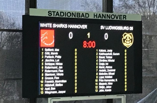 Guter Start für Ludwigsburg: die zweite Minute, das 0:1 für den SVL durch Guram Kutchuashvili. Dann Unterzahl Ludwigsburg, kein Gegentreffer. Wenig später Überzahl - aber der Treffer der White Sharks zum 1:1 Ausgleich. Dieses Spiel wird sicherlich schwierig für das Team aus Schwaben. Die Sharks spielen in dieser Saison stark, sie stehen in der Tabelle vor Ludwigsburg auf Platz vier.