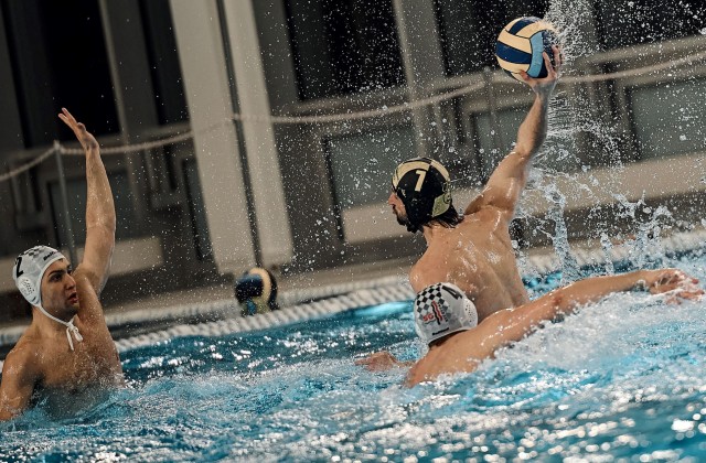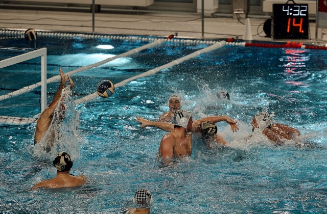Gut eine Stunde vorher. 18 Uhr im Sportbad. Das erste Anschwimmen geht an Neukölln. Ein starker Schuss kommt abgefälscht aufs SVL-Tor. Aber der Keeper Josip Katusa ist blitzschnell und pariert den Ball. Nächster Angriff SG, die nächste Parade. Schrecksekunden für Ludwigsburg. Angriff SVL, auch eine top Parade des SG-Torwarts. Nächster Angriff SVL, Pfosten.