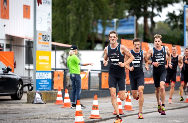 Beim Teamwettbewerb sind die Mannschaften im Abstand von jeweils 30 Sekunden ins Rennen gegangen, die jeweils vier Sportler je Team mussten zusammenbleiben, sprich immer gut kooperieren und sich verständigen. Einer durfte über den gesamten Triathlon auf der Strecke bleiben, die Zeit des jeweils Dritten wurde gewertet. Nach dem starken Schwimmen musste Cornelius bereits auf dem Rad abreißen lassen, wegen eines Infekts hatte er nicht voll trainieren können. Cornelius fiel also bald zurück, das verbliebene Trio hatte auch deshalb schlechte Karten beim Biken, denn ein Team ist zu viert eigentlich immer schneller als zu dritt, wegen des häufigeren Wechsels bei der Führungsarbeit vorne im Wind.