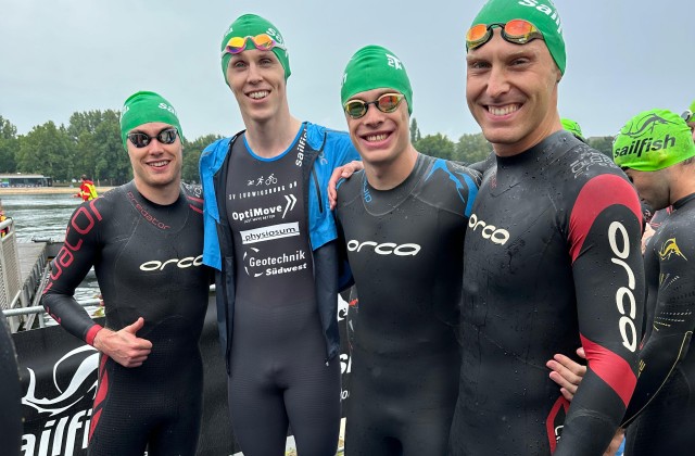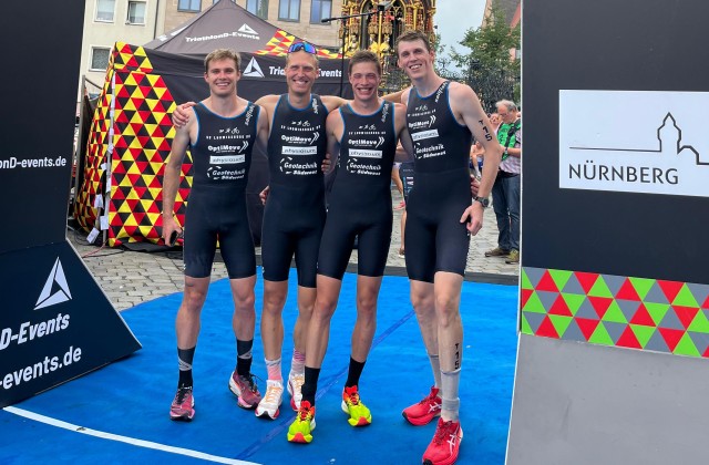 „Fühlt sich an wie ein Sieg“, sagt Max Hoffmann - bis kurz vor dem Schlussspurt ist der Mann von Team SVL beim Triathlon in Nürnberg ganz vorne gerannt. Dann indes musste er drei Konkurrenten vorbeiziehen lassen, unter anderem seinen Mannschaftskollegen Julian Großkopf, der schlussendlich auf Platz drei landete. Max wurde vierter. Lasse Friedrichs hat Platz 13 geholt, Cornelius Theus Platz 32.