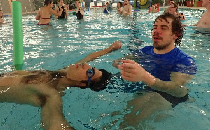 Eine weitere Besonderheit ist, daß das Wasser nicht gechlort, sondern mit Sauerstoff angereichert ist. Auch die diagonal geschwungene Holzdecke ist speziell bei Rückenlage eine Herausforderung für alle Teilnehmer.